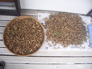 | 採取したピーナッツをベランダに干します。 この実は生でも食べられます。 なんとも言えない我が家の味でした。 もう初冬、これからまだヤーコンの収穫があります。 |