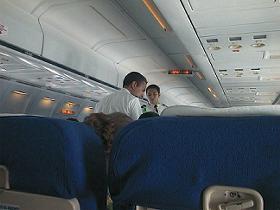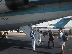 9時半、飛行機はまずグアヤキルへ飛びました。途中、窓の左側にエクアドルの巨峰コトパクシとチンボラソが見えます。乗客はワイワイ言いながら左窓に注目します。新幹線から富士山を見ようとするお登りさんと変わりありません。私たちは右側の席なので残念ながらよく見えませんでした。チンボラソ(ちょっと恥ずかしい名前です)は窓際の席にいるの若い女性に撮ってもらいました。その女性は次々とカメラを手渡されるので、チップをよこせ、とばかりに手のひらを振って笑いました。