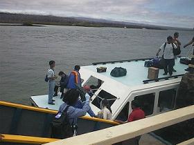 彼に導かれてバスで移動、小さな船着き場でハシケに乗り換え、サンタクルス島へ渡ります。そこから彼の車、トヨタのランクルで誰もいない道をひたすらぶっとばします。途中山を越えましたが、山の部分は霧に覆われ、(映画「ジュラシック・パーク」のイメージです)そこから緑が濃くなって風が冷たくなりました。50分ほど走ってプエトロ・アヨラの町に着きました。