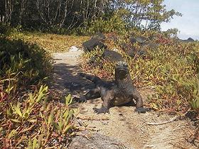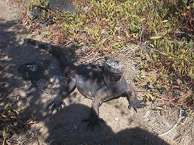大きなペリカンや、プテラノドンのようなグンカンドリが空を舞い、魚を目掛けて湾に飛び込んでいきます。原始の風景を見るようです。バンガローの外に出て波打ち際へ歩いていくと、小道にイグアナがいました。60センチほどの海イグアナで、もっさりしています。生きているのか死んでいるのかわかりません。でも、顔をよく見ると眠そうな目を開けています。とりあえず写真を撮って海岸に出ました。