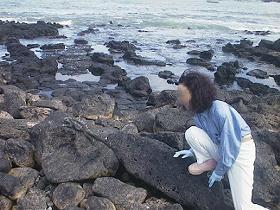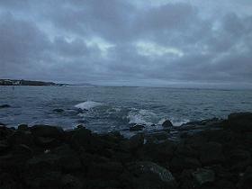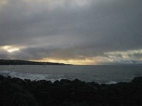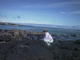 5時になってもまだ真っ暗。6時になるとうっすらと白み始め、7時にやっと夜が明けました。これはやっぱり本土との時間差が問題だと、時計をあわてて1時間戻しました。今度はガラパゴス時間で6時20分、朝の海を見に行きます。今にも泣き出しそうな重い雲がたちこめています。風の中にポツポツと雨の粒が混じっています。暗い波間をペリカンが滑空していきます。黄色い朝焼けがうっすらと水平線を染めていきます。カメラを構えて朝焼けの空を撮ろうとすると、足元の岩の間からイグアナが這い出してきました。80センチくらいの大物です。彼らの出勤時間もけっこう早いようです。