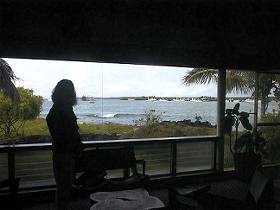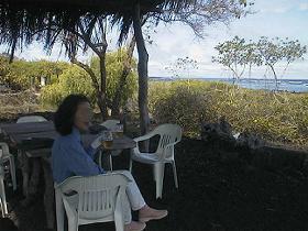 プエトロ・アヨラの中心からアカデミー湾をまたいで反対側にホテル・ガラパゴスがあります。ハイビスカスの花咲く緑の中に点々とバンガローがあって、ホテルというよりはキャンプ場という感じです。レストラン兼管理棟の中から見る景色は素晴らしい。目の前が波騒ぐ湾です。潮風の匂いが突き刺さるようです。思わず「ブラーボ!」と叫んでしまいます。