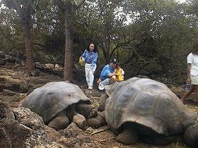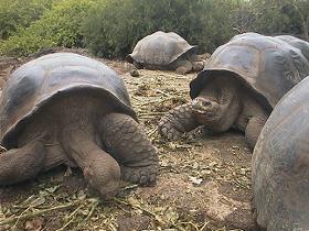 ハイライトはゾウガメの飼育所です。各種のゾウガメが谷の間に保護飼育されていて、その上に作られた橋から観察します。後半はすぐ側へも近づけます。巨大なゾウガメには圧倒されます。「ロンサム・ジョージ」として有名な一頭だけ残った種類のゾウガメがいて、広いスペースに二頭のメスといっしょに暮らしています。「メスには名前はないんですか?」と聞くと、ベロニカさんは苦笑して「ジョージアナ&ジョルジョーネ」と答えました。そのまんまです。