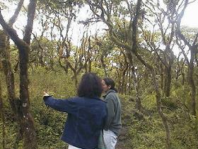 サンタ・ロサ村を通り、途中でボーイフレンドを降ろし、国立公園の中に入って最初に霧に包まれた高地北側の湿地を歩き、植物相を探索します。木々に厚いコケがはりつき、パラサイト・プラントがからみついています。