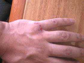 私は石の上で滑って、左手を打ってしまいました。後から見るとすりむいて血が出ていたので、ハンカチでしばりました。