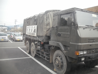 | ボランティアセンターのエントランスには自衛隊の車両が停車していて、炊事班らしい隊員がご飯を炊いています。ボランティアたちはここにいったん集まり、ワッペンを支給されて各地に配送され、割り当てられた仕事をします。 | ||||