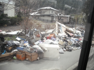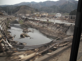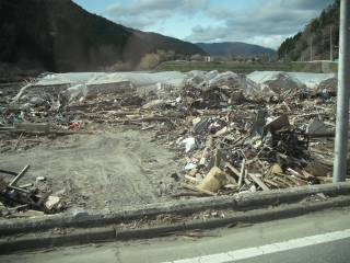 | 気仙川上流に当たるこの地域、建物の跡と思える空間と両側に打ち上げられた瓦礫とが乱雑に広がっています。陸前高田市内からかなり離れたこの地域でこんな有様では、海に近い中心部はどんな被害だったのだろう、と想像すると背筋が寒くなる光景でした。 | ||||