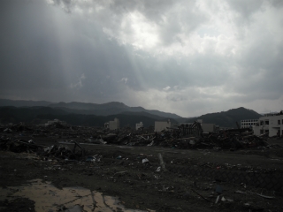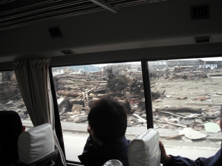 | 市内を視察したこの日、空は厚い雲に覆われ、時たま激しい雨が降りました。被災者の涙雨かと思われます。この日の新聞記事に『被災地に入り込み、道に自動車を停めて撮影に夢中になり、工事用車両やまだ遺体捜索作業中の自衛隊車にクラクションを浴びる不心得者もいる』とあり、そうした集団に思われないように控えめの取材でした。 報告その2 ボランティア活動編へ |