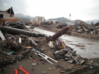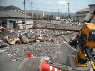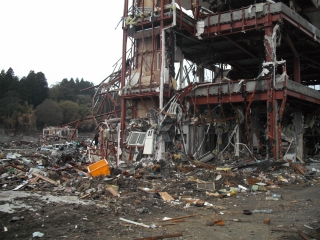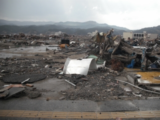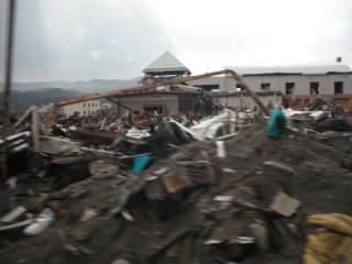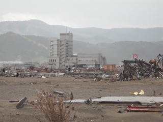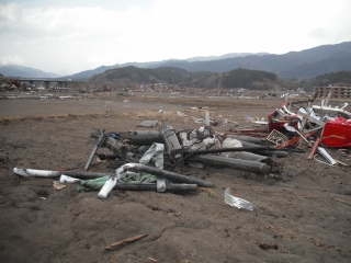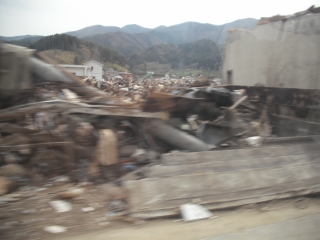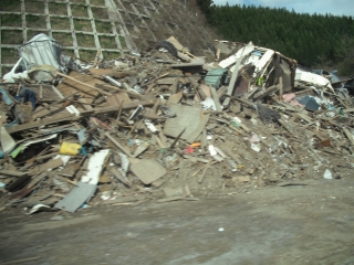 | 大船渡市は人口五万の比較的大きな街です。縦に長い地形のせいでしょうが、大きな被害があったのは港湾部と盛川に沿った低地部分だけで、両岸の高い地域は無事なようです。ボランティアセンターのある社会福祉会館やその隣りの大船渡警察、市役所や避難センターになっているリアスホールなどは機能しています。しかし太平洋セメントの工場は巨大なパイプやタンクが倒れたりつぶれたりで、とうぶん復活しそうにない感じです。 住宅区域も整理されていますが、積み上げられた瓦礫がどこまでも続き、これを撤去するには何年もかかるのではないかと思われました。 |