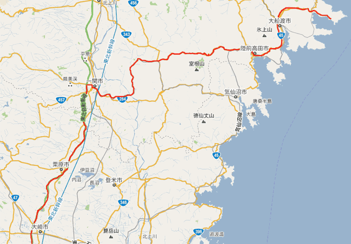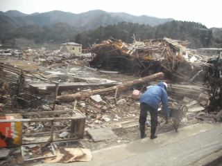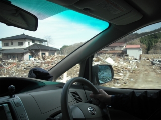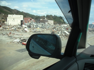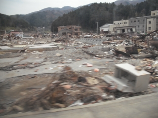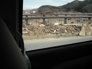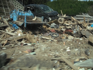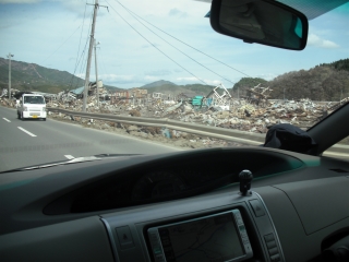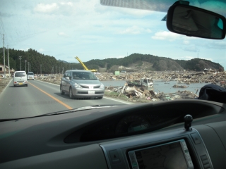| 2011年5月2日、午前5時に家を出て上野駅午前6時集合。そこで先輩のK氏と落ち合い、同じく先輩Y氏の支援物資を積み込んだエスティマに乗り込んで岩手県に向かいました。このレポート第一部は震災現場の写真を中心にした被災地レポートにしました。活動報告は第二部に書く予定です。 駒形から首都高に乗り、川口線経由で東北自動車道に乗ります。早朝にしては車が多く、渋滞するほどではないものの、前後に車が途切れることがありません。そのまま浦和・岩槻と通り過ぎます。途中で携帯電話で都内西部から来るもう一台の車と連絡を取り、SAで落ち合うことにします。しかし蓮田は混雑していてパス、佐野SAに停車しました。そこで一同七人が集合。私は初対面の二人と挨拶を交わしました。 簡単な朝食の後一路東北に向かい、昼食休憩の長者原SAまでひたすら距離を稼ぎます。一関インターを降りたのは午後1時頃、それから今泉街道を北東へ進み、猊鼻渓をかすめて陸前高田の外れを過ぎました。そこで最初のショック画面を目撃しました。 |
