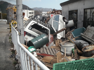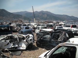 | 港湾部埋立地の一角は被災した自動車の集積場になっています。ボランティア初日にはここで分類登録の仕事をしました。数千台にのぼる自動車の墓場ですが、カーナビやアルミホイルなど金目のものを狙った窃盗・車上荒らしが横行しているという話で、実際その形跡がありました。多くのボランティアがいるのと同時に、火事場泥棒という言葉通りの悪質な犯罪者がいるのが現実です。 | ||||