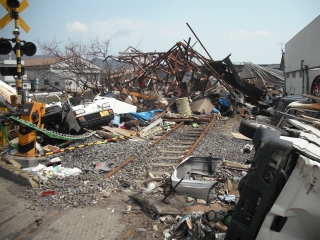 | ボランティアセンターから川寄りに少し歩くともう被害が広がっています。南リアス線と貨物用引込み線の両方がぐちゃぐちゃにつぶれ、線路が流されています。大船渡婦人センターが流されて廃墟になっています。まだ撤去されていない自動車もたくさんありました。 | ||||
