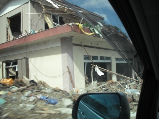 | 真ん中に残っている白いビルは漁協の建物ですが、三階まで破壊されてもはや使い物になりません。周囲の瓦礫は自衛隊が片付けたそうで、大船渡市内に比べると整理されています。それでも生き残った船はわずか、灯台まで破壊され、漁港として復活するには遠い道のりがありそうです。 | ||||