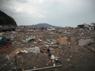 | 越喜来(おきらい)湾の奥、大船渡市三陸町の中心部もほぼ全滅という状態です。全体的には大船渡市中心部を一回り小さくした感じで、自衛隊がばら撒かれた瓦礫をブルドーザーでかき集め、山にしています。そのために道路は通れるようになり、適当なスペースも開いて整理された印象ですが、残った瓦礫の山がどうなるのか、いつになったら片付くのか気になります。 | ||||