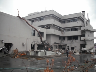 | 市内西部にある高田市立病院。四階まで水に浸かり、屋上に逃げた職員と患者たちは足元を水に洗われながらも助かったそうです。ただ厨房にいた職員三名がなくなったとか。 その恐怖は想像に余りあります。 |