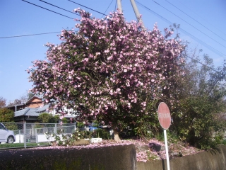 | ◆まだ前日の佐賀。 雨が上がって青い空にサザンカが映えている。佐賀のサザンカはまるで桜のようにあでやかです。これでも盛りは過ぎていて、山のような花びらが足元に積もっています。 |