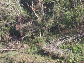 | ◆大雨が続いたせいか、山の潅木が倒れています。間伐がなされず、地面が飽和してしまうという面もありますが、これは杉林ではないので、ちょっと違うようです。 どちらにしろ、山が荒れているのはたしかなようです。 |