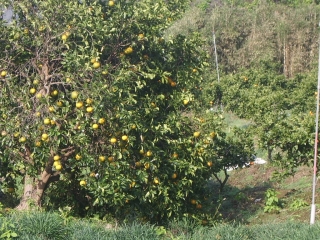 | ◆クリークの周囲はミカン畑です。しかし今年は例年よりも早い摘果があったようで、金色の畑にはお目にかかりませんでした。一本だけ摘果前の木がありました。でも地味ですね。 |