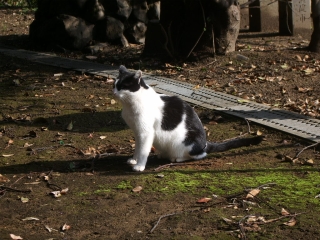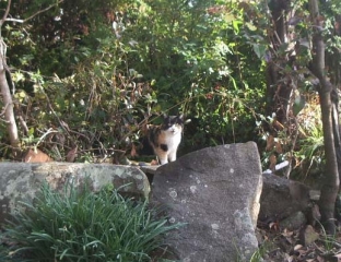 | ◆登っていくと、面倒くさそうに道を開けました。中型オスのニ毛猫です。呼んでもこちらには来ませんでした。 |