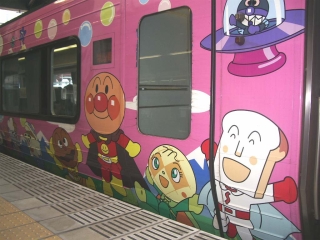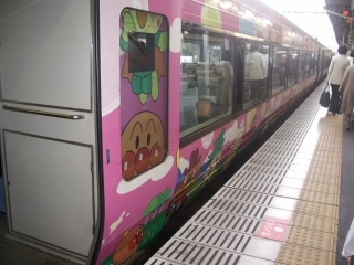 ホームに来た電車を見てびっくり、全面にアンパンマンのキャラクターが描かれています。 「南風7号・アンパンマン号」と言うのです。 作者のやなせ・たかしさんが高知出身だからです。行ったことはないのですが土佐山田市にはアンパンマン・ミュージアムがあります。ちなみに高知には「横山隆一記念まんが館」「はらたいら記念館」もあります。はらたいらさんは、テレビタレントとして有名だけど漫画のヒット作ってあったっけ? |