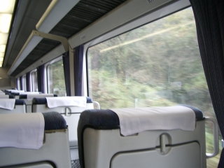 ◆四国山地を越えるルートに入ります。 土讃線は厳しいルートなので、本線にもかかわらず単線なので両側に山林が迫ります。特急なのに時々上り線の電車との待ち合わせ停車があります。 |
