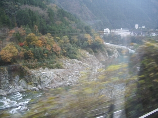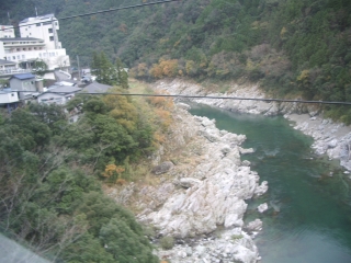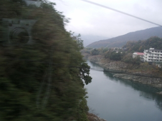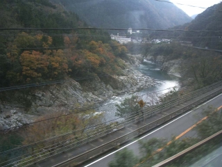 ◆小歩危の渓流を通り過ぎたところです。 大歩危は列車からは見えにくい位置なので、こちらのほうが鑑賞にはよろしいようです。 |