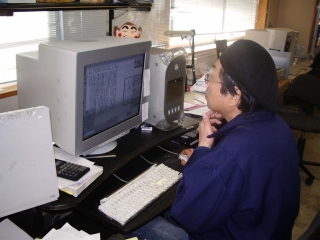 ◆翌日、日曜出勤してやりかけの仕事に取り組むナンジーさん。 職場のパソコンはマックのG4です。21インチディスプレイが圧倒的です。 |