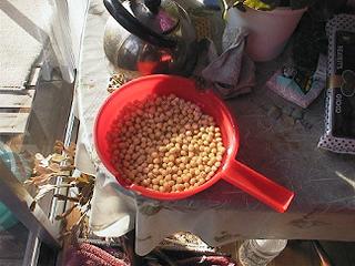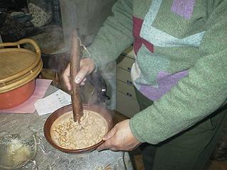 | 大豆をつぶします。今回は少量なのですり鉢にスリコギでつぶしました。 | ||