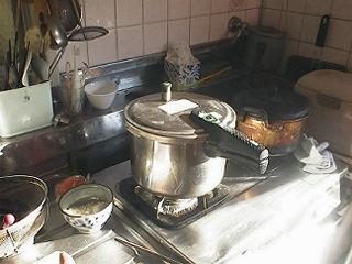 | 水を入れ替えて、豆を鍋で煮ます。普通の鍋の場合は5時間ほど煮てください。 圧力鍋の場合は30分くらい煮てから、新聞紙で包んだりして5時間保温します。うちでは新聞紙を詰めたダンボールで保温箱を作り、その中に押し込みます。大豆がかんたんに指でつぶれるくらい柔らかくなったらOKです。 |