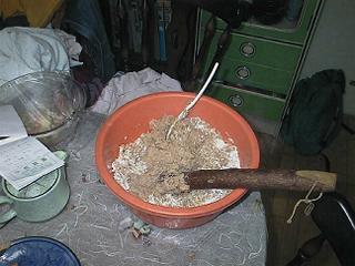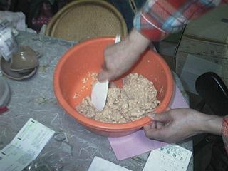 | 煮込んでつぶした大豆と塩麹を混ぜます。しゃもじでもいいのですが、よく混ぜるにはやはり手を使うほうが簡単です。ゴム手袋などをしたほうがいいかもしれません。 (私は面倒なのでしませんが……なお、大量の大豆をつぶす時にはスリコギでは間に合わないのでコショウ入れなど固くて軽いものを使うと具合がいいです) |