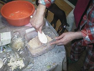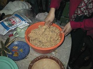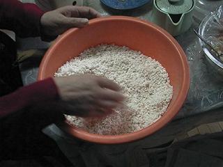 | 本格熟成味噌は塩分が倍になります。 (大豆2キロ・麹2キロ・あら塩1キロ……レシピによってはこの比率が違います。私たちは経験的にこの比率が一番おいしいと思います) 大豆を煮る過程は速成味噌と同じです。麹を細かく砕いてあら塩とよく混ぜます。けっこう疲れる作業です。 |