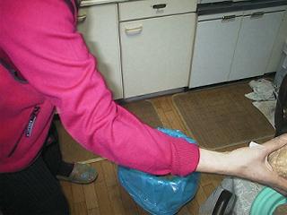 | 隙間や穴がないように、上から押し込みます。空気を押し出しながらビニール袋の口を1枚ずつしばります。 | ||