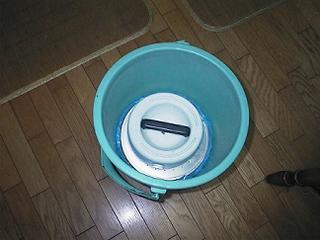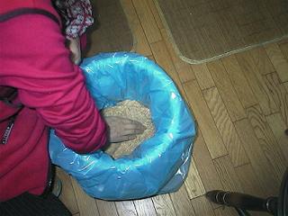 | 保存する樽かバケツに2重にビニール袋を張り、味噌球を投げ込みます。 | ||