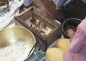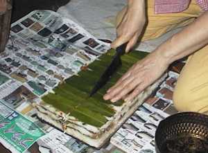 押し箱に茗荷の葉を敷き、寿司飯をしきつめる(訳1cm)