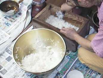 @1升5合(これは木箱のサイズによる)の米を炊き、寿司飯をつくります。