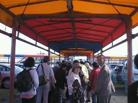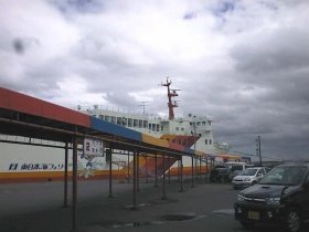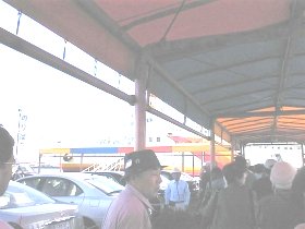 | フェリーが到着し、降りる客と乗る客のすれ違いが起こります。通路が狭いためにみんな迷惑している様子です。職員がうまく整理すればいいのに、と思います。 |