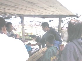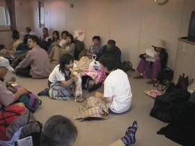 二等船室中央部分の右舷側に陣取ります。みなさん、べったし座って足を伸ばしていますが、一部ではあぐらをかいたり、ひざを立てないといけない人口密集地もあります。 真ん中の女の子たちが犬を持ち込んでいました。小型のチワワですが、いいのかな?と思います。女の子たちは周囲に気兼ねもなく犬と遊んでいます。 |