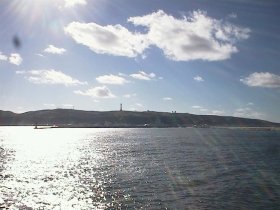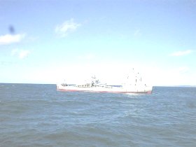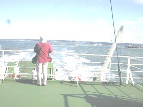 外洋に出て、フェリーは波を蹴立てて走ります。時々大きく揺れ、窓の風景がエレベータのように上下します。ビルの4階分くらいの横揺れです。どうやら荒れた海を大きく旋回しているからのようです。 | |