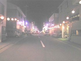 もう一人の客に身の上話など聞き、「沓形港は夕日の名所なんですよ」と言われたので、浴衣にサンダルで港まで歩きました。しかしとっくに夕日はなく、町の軒には祭り提灯が燈っていました。 空には12夜くらいの月がかかり、寂しさやわびしさは感じないものの、怪しい夜でした。 |