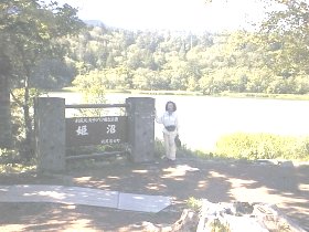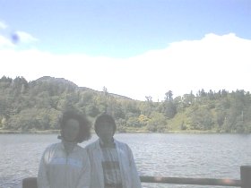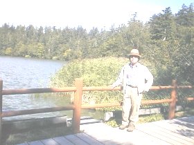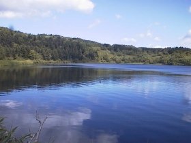 最初の観光地は島の北側にある「姫沼」です。 十和田湖に似た印象ですが、少し狭いようです。沼というからには深さもないのでしょう。でも、森に包まれてなかなかいい雰囲気です。 |