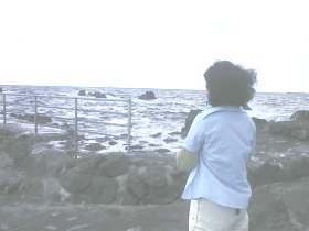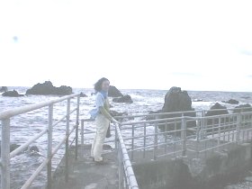 | 岩の間をセメントで固めた遊歩道は、ところどころ波に洗われています。タイミングが悪いとずぶ濡れで、実際に子どもたちが水浸しになっていました。 |