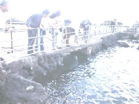 岸辺を囲った生簀の中には数頭のアザラシが泳いでいました。観光客が餌をあげています。 | |