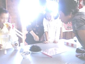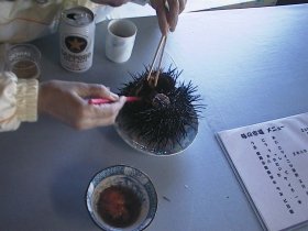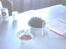 | 隣りのテーブルに来た親子が、私たちのウニを見てビックリしていました。「見せてください」と言って覗き込みます。ウニは割られているのにモゾモゾ動きます。 子どもは半分怖がっています。 |