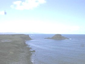 鴛泊湾の北西にあるペシ岬展望台に来ました。 手前にあるのがポンモシリ島、向こうに霞んでいるのが礼文島です。 |