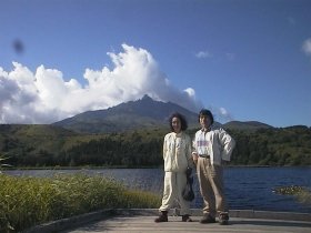| 1時間ほど休憩していると、突然山頂が顔を覗かせました。バイクで来ていた若者たちが私たちに「写真を撮ってくれ」と頼みます。二組の写真を撮影し、こちらも撮ってもらいました。 今年の年賀状の図柄はこれに決まりでしょう。 |