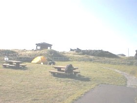 | 黄色いテントはバイクのツーリストで、疲れているらしくテーブルにつっぷして仮眠していました。その向こうに見えるのは八角形のミニ・ビジターセンターです。 |