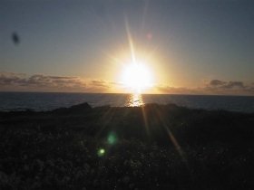 海に落ちていく太陽。 でも、ちょっと水平線に雲が多いようです。 |