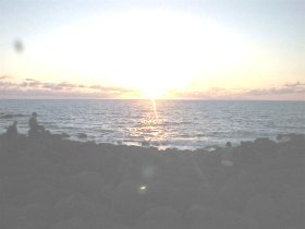 | 波間を夕日が彩りますが、ここまで。空と海が真っ赤に染まるところまではいきませんでした。若者たちは海岸の岩やテトラポットの上でそれを眺めています。 中には弁当とビールで宴会をやっているカップルもいました。二日目の旅が終わりました。 |