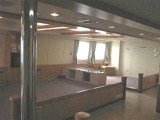9:00、日本人の職員によるパスポートと乗船券チェックを簡単に済ませ、ボーディングになります。わりあいあっさりしたものです。乗組員に案内されたのはフェリー前方の2等席で、低いしきりで分けられた雑魚寝フロアです。他に客は一人だけだったので、私たちは内側の6畳くらいのスペースを二人で占拠しました。かみさんは毛布を敷いて寝てしまいます。考えてみればゆっくり寝ていけるこういう旅は飛行機のスーパーシートより快適です。