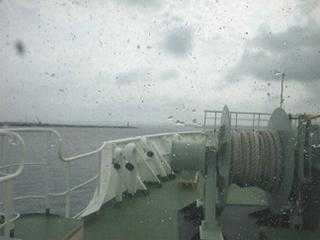 窓の外は荒れ模様で、灰色の空と海が広がっています。窓ガラスは雨粒で曇っています。甲板に上がってもガスで何も見えません。大型フェリーなのに波が高いせいかよく揺れます。私たちは一人3枚必要だと言われている税関の申告書を書きました。